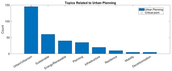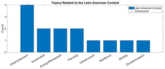 Finally, in this case, Figure 7 shows that, among the 10 studies analyzed in the Latin American context, urban planning is the most frequently addressed topic with approximately four mentions. At the same time, infrastructure, resilience, mobility, and decarbonization appear with only approximately one mention each. Topics such as sustainability, energy/renewables, and planning have an intermediate representation with approximately two mentions.