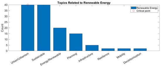 The analysis identified 79 energy studies linked to urban planning and decarbonization, revealing limited and fragmented production. As Figure 5 shows, the most frequent topics are urban planning, sustainability, and energy/renewables (≈140 mentions), reflecting a consolidated interest in the relationship between renewable energy and urban sustainability.