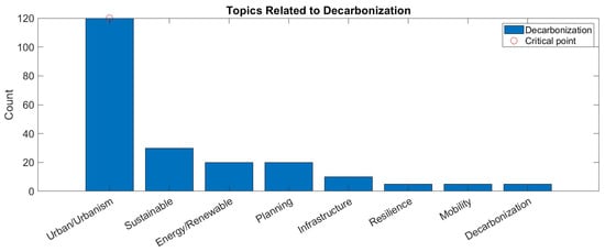 Figure 6 shows that, among the 147 studies analyzed on decarbonization, the term “urban/urbanism” predominates with approximately 120 mentions. In contrast, terms such as “decarbonization”, “mobility”, and “resilience” barely exceed five mentions each. Intermediate topics such as sustainability, energy/renewables, and planning have a moderate frequency, highlighting an unbalanced focus in the literature.