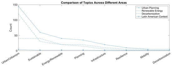 It is essential to compare the results to identify differences or similarities. Figure 8 compares the frequency of key themes in four areas: Urban planning, renewable energy, decarbonization, and the Latin American context. Urban planning presents the highest concentration of themes, with up to 145 mentions in “sustainability”. In contrast, in the Latin American context, the number of mentions does not exceed four in any area. In decarbonization, despite being the central focus, themes such as resilience and decarbonization barely reach five mentions each, reflecting a weak integration between these concepts.