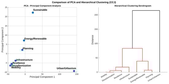 The multivariate analysis applied in this study is based on the cross-analysis of key terms obtained through a structured literature review, emphasizing urban planning, energy, decarbonization, and sustainability. From the processed metadata, a matrix of relative occurrence and thematic relationships was constructed, which was subsequently subjected to two complementary techniques presented in Figure 9: Principal Component Analysis (PCA) and Hierarchical Clustering (HCC). PCA reduces the dimensionality of the set of variables, identifying the axes that explain most of the variance in the data. In parallel, HCC allows the concepts with the most excellent semantic proximity to be grouped using a similarity matrix.