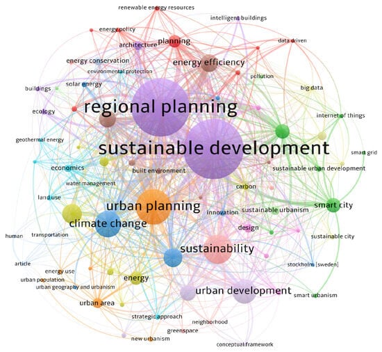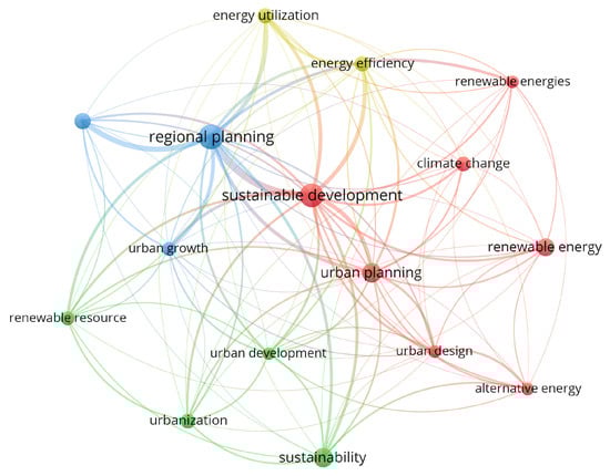 Figure 10 represents a segment of research highlighting the co-occurrence among key terms related to energy, decarbonization, urban planning, and sustainability, all of which are central elements in studying sustainable urban development. The map, created by VOS viewer, shows terms based on their frequency and relationships within scientific publications. Notable terms such as “regional planning”, “sustainable development”, and “urban planning” hold central positions within this knowledge framework. The colors group related themes, clearly showing the interconnectedness among urban planning, energy efficiency, climate change mitigation, and innovative city development. This analysis demonstrates how these areas converge within current research, emphasizing the importance of integrated strategies for achieving urban sustainability.