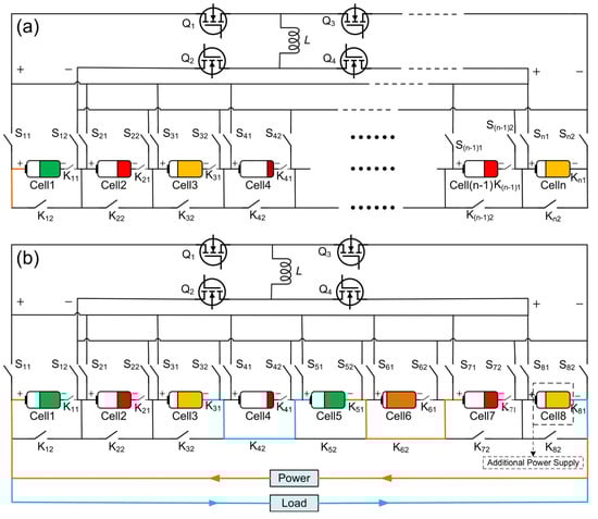 Figure 1a) has been proposed. By controlling the switch array, this topology can dynamically combine series-connected battery packs to achieve multi-cell-to-multi-cell balancing. The main structure includes a reconfigurable circuit, a Buck–Boost active balancing circuit and a switch array. The switch array consists of positive electrode switches (S