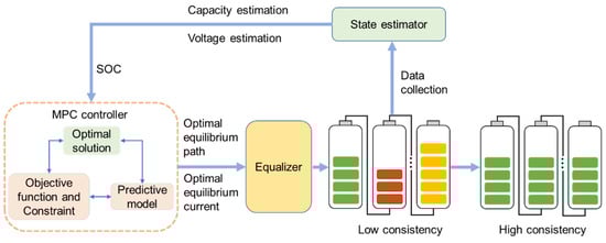 Figure 2. It mainly includes four parts: the battery pack, the battery state observer estimator, the MPC controller, and the battery pack balancer. The battery state estimator estimates the SOC of the battery based on the collected data, such as battery voltage and capacity, and transmits it as input to the MPC controller. The MPC controller, based on the battery pack SOC data, calculates the optimal energy transfer direction and the optimal balancing current under the preset objective function and constraints. Finally, the controller transmits the obtained control actions to the balancer, which converts the actions to be executed into a series of switch openings and closings, thereby achieving the optimal balancing control of the battery pack.