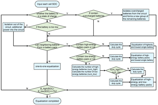 During the charging and discharging state of the battery pack, first determine whether there are any batteries with excessively high/low energy within the pack. If not, proceed directly to balancing. If there are, isolate them from the circuit and form a new group with the remaining batteries for balancing. During battery discharging, if a battery with low energy is isolated from the circuit, an additional power source is connected to the circuit to replace the isolated battery for discharging. The balancing control strategy is shown in