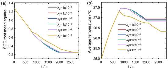 A larger λ2 suppresses the temperature rise of the battery pack but increases the equalization time. When λ2 = 1 × 10−3, the battery pack equalization time increases by 36.09% compared with when λ2 = 1 × 10−8, and the battery pack average maximum temperature value decreases by 1.68%, and the average temperature of the battery pack decreased by 2.41% when equalization was completed. In actual situations, users can choose appropriate weights based on this conclusion to balance the relationship between equalization time and energy loss. It can be seen from the figure that λ2 = 1 × 10−4 better balances these two conflicting goals. Therefore, this article selects this weight for subsequent simulation analysis.