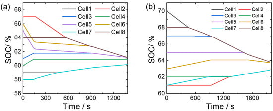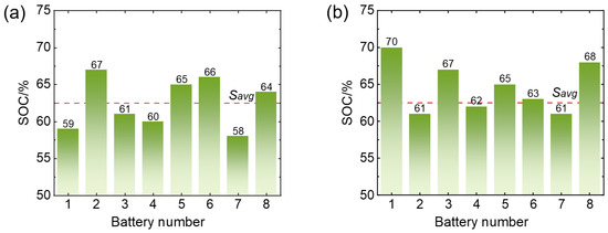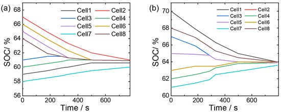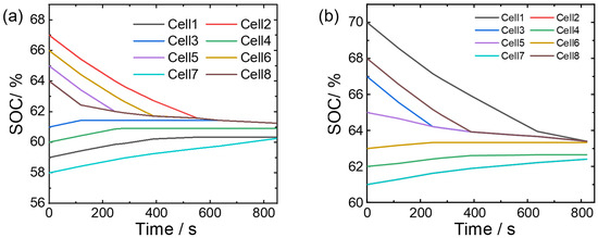 Figure 8a, with a total balancing time of 850.18 s. After balancing, the SOC of each individual battery is 60.33%, 61.16%, 61.16%, 60.92%, 61.16%, 61.16%, 60.16%, and 61.16%, with a variance of 0.1653. Approximate variations also occurred in the initial SOC values of the second group (
