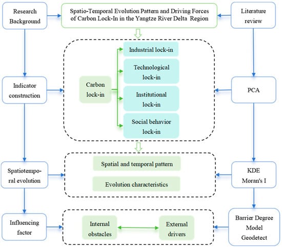 The following are the contributions of this study to existing research. Firstly, this paper offers a systematic analysis of the mechanisms driving carbon lock-in. Building on the foundational connotation of carbon lock-in, the study examines its underlying dynamics within four aspects: industrial lock-in, technological lock-in, institutional lock-in, and social-behavioral lock-in. Based on these dimensions, a comprehensive measurement framework for assessing carbon lock-in levels is constructed to facilitate deeper insights into its persistence and mitigation pathways. Secondly, PCA is applied to evaluate the carbon lock-in level and its sub-dimensions in the YRD region, and the spatial and temporal evolution patterns and spatial characteristics of the overall carbon lock-in and its sub-dimension lock-in levels are comprehensively analyzed. Thirdly, this study examines the internal and external factors affecting carbon lock-in within the YRD region. They offer solid evidence for advancing the high-quality integrated development of this area and its transition to a green, low-carbon economy. The research process described in this paper is shown in Figure 1.