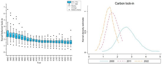 Figure 3, Figure 4, Figure 5 and Figure 6 depict the trends in the sub-dimensions of carbon lock-in in the YRD region. Figure 3, Figure 4 and Figure 5 reveal that the temporal trends of industrial lock-in, technological lock-in, and institutional lock-in in YRD cities aligned closely with the overall carbon lock-in trend, with a weakening carbon lock-in intensity since 2000. And the kernel density curves for these sub-dimensions progressively shifted leftward, signifying a gradual reduction in lock-in levels and a concentration at lower levels. Additionally, the shortening of the right-hand tails of the curves suggests that more cities are transitioning to states of reduced lock-in. However, Figure 6 shows a different trend for social behavioral lock-in, which rose from 2000 to 2012 and then fluctuated to a relatively stable level. In 2000, the kernel density curve for social behavioral lock-in shifted to the right, indicating an increasing and high concentration of social behavioral lock-in over time. This highlights the challenge of breaking the high carbon lock-in pattern in social behavior, which becomes a critical issue to address. Addressing this challenge requires the development of targeted strategies to fundamentally alter high-carbon behavioral patterns, a key factor in mitigating carbon lock-in in the future.
