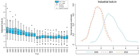 Box plot and kernel density estimate of industrial lock-in for the YRD region.