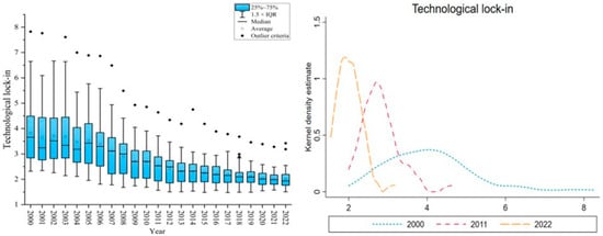 Box plot and kernel density estimate of technological lock-in for the YRD region.