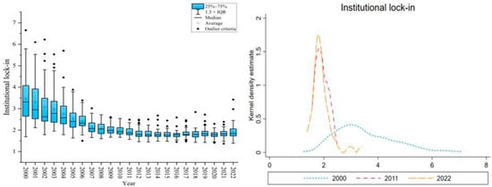 Box plot and kernel density estimate of institutional lock-in for the YRD region.