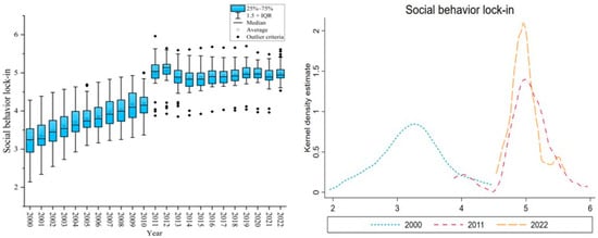 Box plot and kernel density estimate of social behavior lock-in for the YRD region.