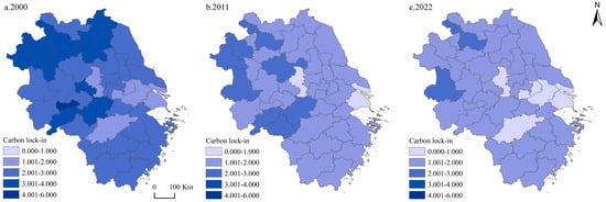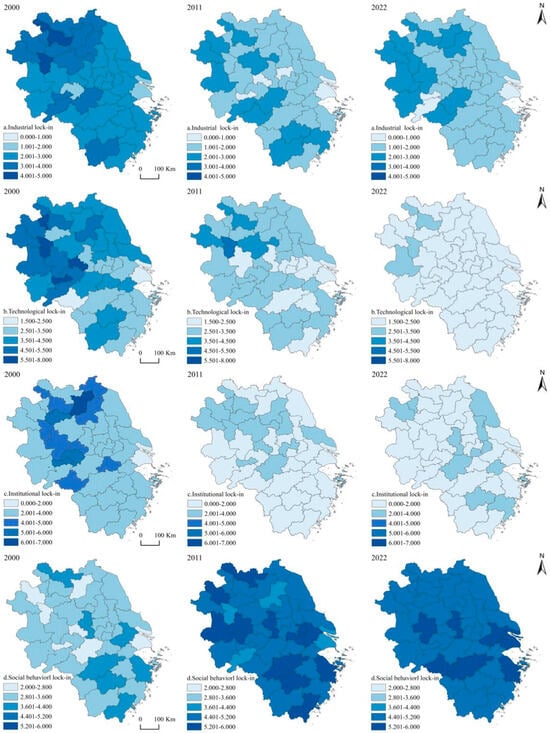 To investigate the shifts in the geographical distribution pattern and the degree of the carbon lock-in phenomenon, each dimension was classified into five categories: very high, high, medium, low, and very low. Spatial visualizations covering 2000, 2011, and 2022 were created with the ArcGIS 10.8 software. As shown in Figure 7, the spatial differentiation in carbon lock-in across the YRD region had generally narrowed over time. In 2000, the region displayed a generally high carbon lock-in level. Lower-value areas were primarily concentrated in core cities such as Nanjing, Suzhou, and Hangzhou, while peripheral cities, particularly in the western and northern parts of Anhui, exhibited higher levels of lock-in. By 2011, a downward trend in carbon lock-in levels became apparent, with many cities in southern Zhejiang, northern Jiangsu, and Anhui shifting from high to medium or relatively low levels, displaying a “high in the west and low in the east” trend. This pattern continued, with all cities achieving lower levels of carbon lock-in by 2022. Shanghai, Hangzhou, and Nanjing have seen further reductions in their carbon lock-in. Overall, the carbon lock-in level in the YRD region had decreased, consistently showing a “high in the west and low in the east” distribution.