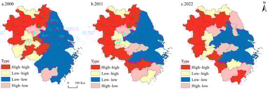 Figure 9 illustrates the local spatial pattern of carbon lock-in within the YRD region for 2000, 2011, and 2022. The spatial distribution of carbon lock-in within the region is characterized by the predominance of high–high and low–low agglomeration types, which are relatively balanced. Over time, the high–high agglomeration type had decreased and dispersed. Moreover, high–high agglomerations had formed in the periphery of relatively underdeveloped areas, including cities in southwestern Zhejiang and western and northern Anhui. These areas are distant from the core economic activities of the YRD and primarily rely on industrial development, leading to greater resistance to low-carbon transformation. Conversely, low–low agglomerations were mainly concentrated in Shanghai, southern Jiangsu, and northern Zhejiang, forming cluster-like spatial agglomerations. This is caused by the YRD core area’s strong economic ties, which drive industrial structure upgrading and green technology development, promoting a carbon-based technological system transition and reducing carbon lock-in.