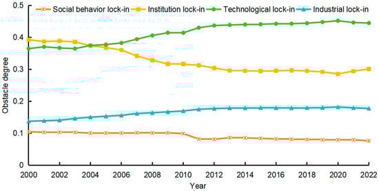 In Figure 10, it is evident that the average barrier degree of technological lock-in was the highest at 41.49%, followed by institutional lock-in and industrial lock-in with average barrier degrees of 31.72% and 16.68%, respectively, while social behavioral lock-in had the lowest average barrier degree at 9.12%. The declining trend in the barrier degrees of institutional lock-in and social behavioral lock-in suggests improvements in the areas, driven by increased environmental awareness and enhanced carbon reduction and emission control systems. In contrast, the barrier degree of technological lock-in fluctuated from 36.48% in 2000 to 44.50% in 2022 and overtook institutional lock-in after 2004, with an average annual increase of approximately 0.36%. The reason for this trend may be that the technological density of the YRD region shows a clear “core-periphery” structure, with a “Z”-shaped technology-intensive zone formed with Hefei, Shanghai, Hangzhou, and Ningbo as the core. Although this structure promotes the technological development of the core region, it also leads to excessive concentration of resources, and the technological development of the peripheral regions lags behind, which increases the difficulty of technological diffusion and forms an obstacle to technological lock-in. The extent of barriers to technological lock-in tends to be more complex and more difficult than institutional lock-in to eliminate. Technology lock-in is not only dependent on the complexity of the technology itself but also on the ability of technology diffusion in the region, the innovation capacity of enterprises, and the synergy capacity of universities and research institutions. For example, the “proximity effect” of technology diffusion suggests that the diffusion of technology within a region is limited by geographical distance and knowledge gaps. Barriers to industrial lock-in also showed a fluctuating upward trend, climbing from 13.77% in 2000 to 17.77% in 2022. Although the growth was modest, it was closely related to the early concentration of secondary industries in the YRD region, which had led to the predominance of traditional heavy industries and energy-intensive industries with high carbon emissions and low energy efficiency. Overall, the main barriers to carbon lock-in are technological lock-in and institutional lock-in in the YRD region, mainly due to the fact that high-carbon technological systems and the existing institutional framework reinforce each other, forming a “technology–institutional complex” that hampers the spread of low-carbon technologies.