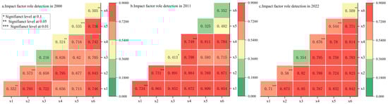 Geodetector model for the impact factors of carbon lock-in levels in the YRD in (a) 2000, (b) 2011, and (c) 2022.