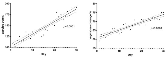 Species count and vegetation coverage within 30 days following ecological corridor construction. p-values indicate the statistical significance of observed trends.