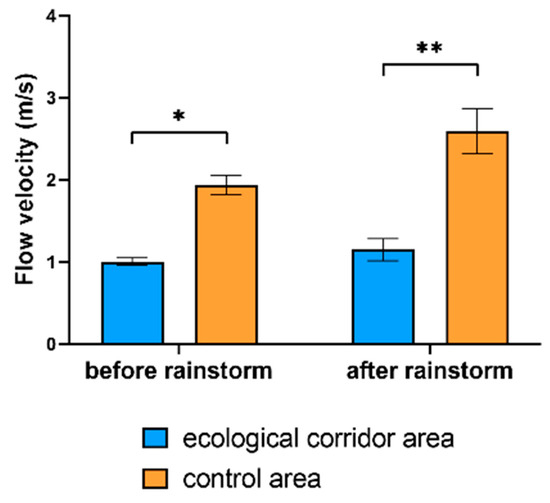 Comparison of flow velocity between the ecological corridor area and the control area before and after the rainstorm event. Asterisks indicate statistically significant differences (* p < 0.05; ** p < 0.01).