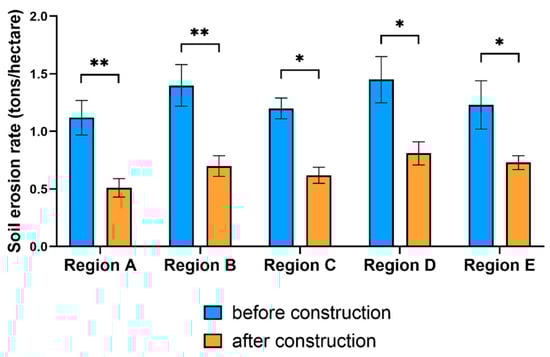 Comparison of soil erosion rates of across five representative regions before and after ecological corridor construction. Asterisks indicate statistically significant differences (* p < 0.05; ** p < 0.01).