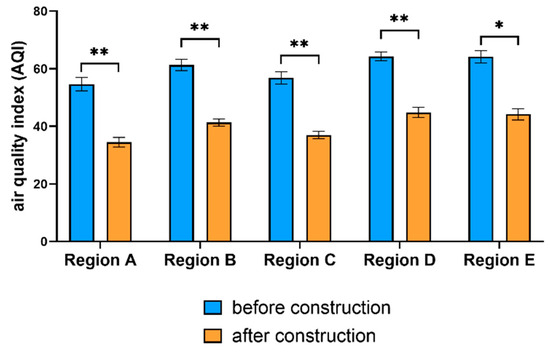 Comparison of the air quality index (AQI) across five representative regions before and after ecological corridor construction. Asterisks indicate statistically significant differences (* p < 0.05; ** p < 0.01).
