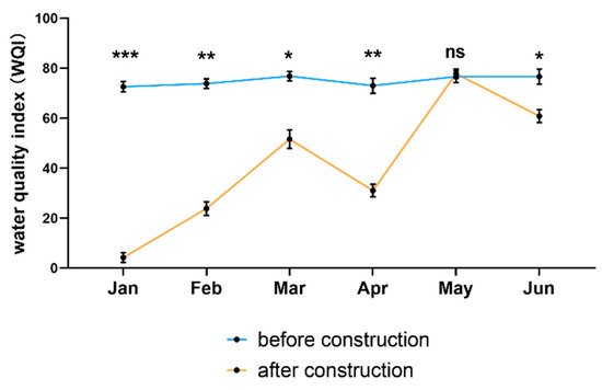 Comparison of the water quality index (WQI) across five representative regions from January to June, before and after the construction of the ecological corridor. Asterisks indicate statistically significant differences (* p < 0.05; ** p < 0.01; *** p < 0.001; ns: not significant).