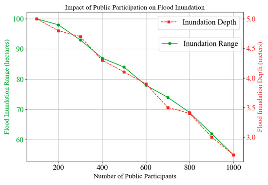 Figure 8 illustrates that with the increase in the degree of public engagement, the inundation area markedly decreases from 100 hectares to 55 hectares, while the inundation depth decreases from 5.0 m to 2.7 m. These results underscore that public involvement serves as a critical pillar for disaster risk reduction. The contribution of community members is particularly valuable in corridor maintenance and emergency response, especially during extreme weather and natural disasters.