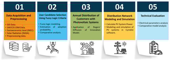 In the first stage, data acquisition and preprocessing, information is collected from the geographic information system (GIS) and the national business system SAP/CIS, in addition to an exploratory analysis of the data. Then, in the second stage, the selection of candidates for the adoption of PV systems is carried out by fuzzy logic, considering multiple variables such as energy consumption, tariff type, socioeconomic level, and solar radiation of the area. This phase also includes the estimation of adoption probabilities using inference rules and a comparative analysis of the developed scenarios.