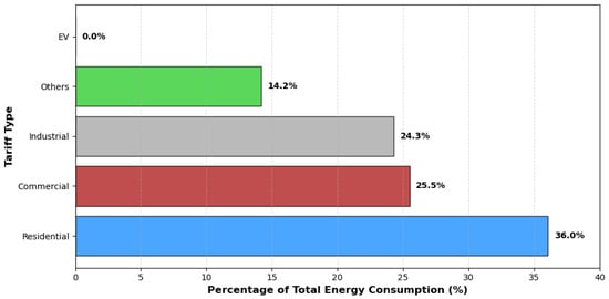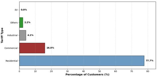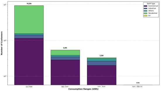 Then again, in Figure 4, most of the users under the residential tariff have a consumption ranging from 111 to 500 kWh, with a total of 93,206 customers in this segment. For higher consumptions, the industrial tariff has a greater incidence in the 1001–5000 kWh range, which evidences its high-energy-consumption character. On the other hand, the commercial tariff shows presence in all consumption ranges, standing out in the 1001–5000 kWh segment, which means that this sector has a more distributed energy demand. Other and EV tariffs have a marginal share in all consumption ranges, suggesting that these customers do not represent a significant segment within the consumption profile of the distribution company.