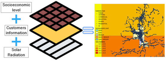 This information was combined with external data obtained from NASA and INEC, which were extracted in shapefile format. To assign each user a radiation value and socioeconomic level, a spatial intersection was performed between the georeferenced database of EEASA users, the radiation polygons provided by NASA and the irregular polygons of INEC that segment the population into socioeconomic levels; the scheme of this process is visualized in Figure 5. During the spatial intersection process, it was identified that socioeconomic data from INEC is only available for provincial urban areas, covering approximately 66% of the study region. As a result, a significant portion of rural zones lacked defined classification. To address this limitation, users without available socioeconomic information were assigned a placeholder category labelled Indefinite. While this treatment introduces a degree of uncertainty, it is important to note that the urban sectors with complete socioeconomic data coincide with areas of higher load density and commercial or industrial activity. These zones are typically associated with customer types that exhibit higher potential for photovoltaic adoption. Therefore, the missing data primarily affects low-density rural areas with lower adoption likelihood. Moreover, to mitigate potential bias, multiple fuzzy logic models were developed using different combinations of input variables. This modelling strategy ensures robustness by avoiding reliance on a single variable and allows the assessment of adoption potential.