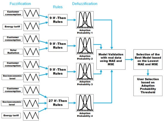 Each model was built using a Mamdani-type fuzzy inference system, in which specific fuzzy functions and fuzzy rules were defined for each combination of variables, with the aim of estimating the probability of PV system adoption for each user, as can be seen in Figure 6.