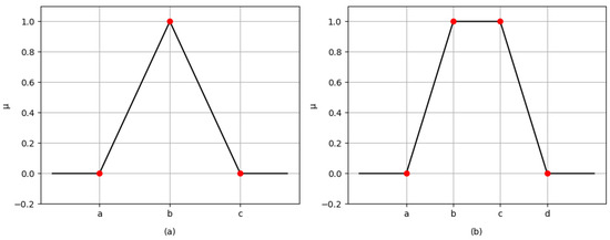 The input variables of energy consumption, electricity tariff, solar radiation, and socioeconomic level were transformed into fuzzy values through membership functions. Two commonly used membership function types were employed: triangular and trapezoidal. These functions were chosen because of their simplicity, computational efficiency, and interpretability, which make them suitable for modelling gradual transitions in fuzzy inference systems [34]. Figure 7 shows the graphical representation of the triangular and trapezoidal membership functions used in this study.
