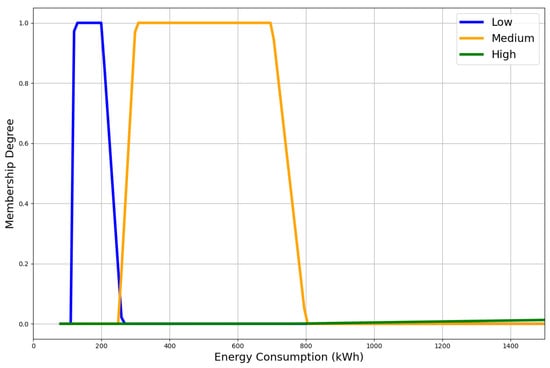 The trapezoidal membership functions were used for the energy consumption variable due to their ability to model broader plateaus, allowing smoother transitions at the boundaries. In contrast, triangular membership functions were applied to electricity tariffs, solar radiation, and socioeconomic levels, which exhibit sharper distinctions between categories and benefit from the simplicity and interpretability of triangular shapes [34,35]. This choice balances the model’s interpretability and flexibility, as confirmed by established research showing that triangular and trapezoidal membership functions are effective even in more complex fuzzy systems [36].