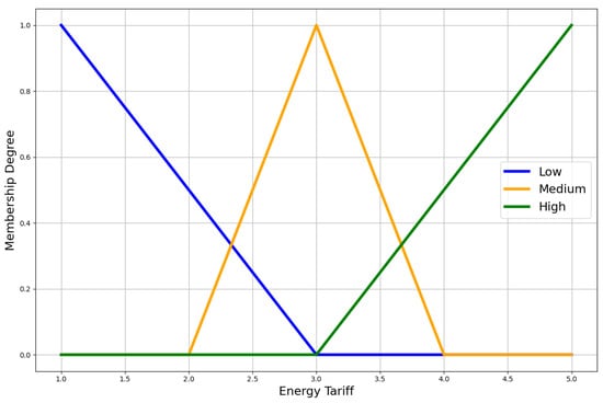 Table 2 shows the types of electricity tariffs; these tariffs refer to the type of use that customers make of energy in their daily activities. In addition, Figure 9 shows the categorization of these tariffs, which were classified into three levels: low, medium and high. Triangular membership functions were used, since the values have a more defined transition between each category.
