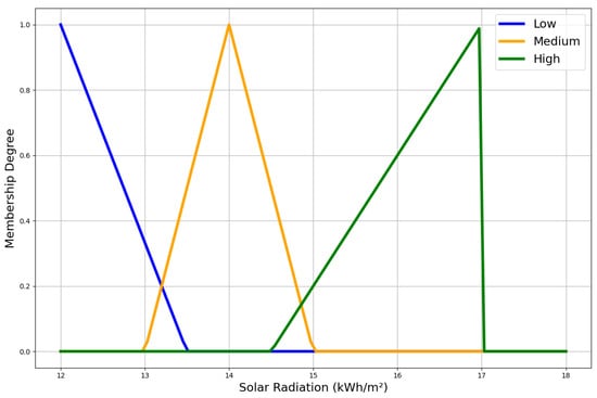 Figure 10 shows the categorization of the solar radiation variable, which was considered at three levels: low, medium and high. Since the solar radiation data have a more limited distribution, triangular belonging functions were used.