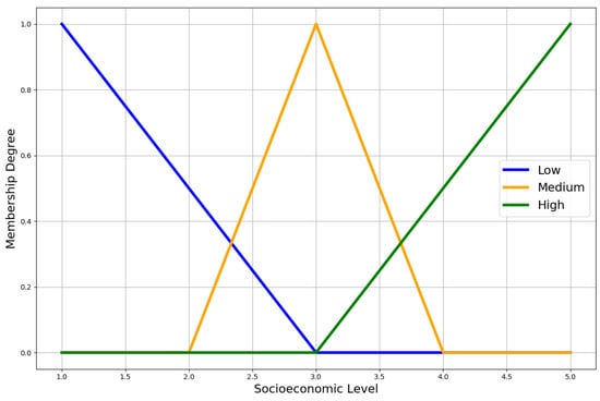 For the analysis, the socioeconomic level has been categorized into three fuzzy sets: low, medium, and high. For this, triangular membership functions were employed due to the progressive nature of transitions between levels, as illustrated in Figure 11. The low category is represented by a triangular function ranging from level 0 to 3, with its peak at 1. The medium category spans the interval from 2 to 4, reaching its maximum membership at 3. The high category is defined over the range of 3 to 5, with its peak at 5. This overlapping structure effectively captures the smooth transition between classes, enhancing the model’s capacity to handle uncertainty and variability in the socioeconomic classification.