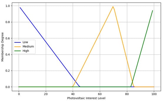 Fuzzy inference has been performed by applying a set of if–then rules, which combine the input variables to generate a fuzzy output. Subsequently, a defuzzification method is applied to convert the output into a numerical value. The output of the system is the probability of PV system adoption, which is classified into three levels: low, medium and high. Triangular membership functions were used to represent this variable, as shown in Figure 12.