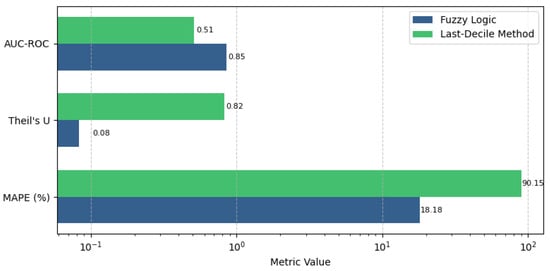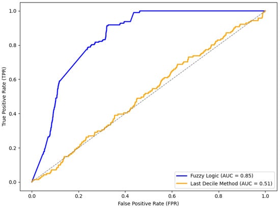 Moreover, the AUC-ROC metric provides further validation of the superiority of the fuzzy logic approach. The fuzzy logic model achieved an AUC of 0.85, indicating strong discriminative ability in distinguishing between adopters and non-adopters. In contrast, the last decile method obtained an AUC of only 0.51, which is close to random classification (AUC = 0.50), further demonstrating its poor predictive power. The higher AUC for the fuzzy logic model confirms that incorporating electricity tariffs beyond energy consumption significantly enhances the model’s ability to accurately predict PV system adoption.