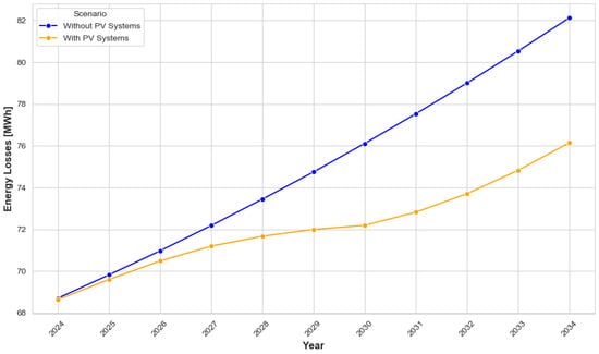 Additionally, results indicate that distributed generation contributes to reducing energy losses over time, as PV systems help decrease the overall loss profile by supplying local demand and minimizing long-distance power flows. However, energy losses continue to rise in both scenarios analysed, suggesting that growing grid demand cannot be entirely offset by DER. This highlights the need for complementary solutions such as grid reinforcements, voltage regulation strategies, and energy storage integration to further optimize power distribution efficiency under high DER penetration levels.