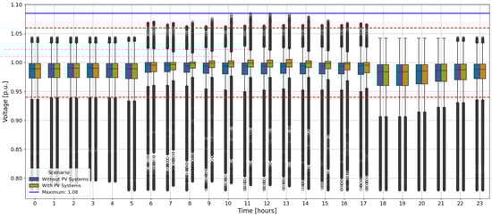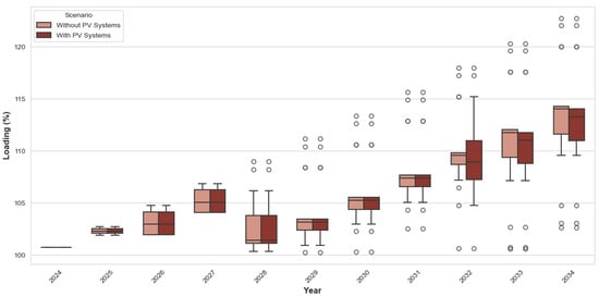 Figure 19. Equipment loading over the planning period. - Voltage Profile: Figure 20 presents the voltage profile over a 24 h period in the year 2034, comparing two scenarios: without PV systems (blue) and with PV systems (brown). The boxplots illustrate the distribution of voltage magnitudes at different times of the day, expressed in per-unit (p.u.) values. The acceptable voltage range under Ecuadorian regulations is ±6% of the nominal voltage, corresponding to the interval [0.94 p.u., 1.06 p.u.], which is indicated by the red dashed lines. Additionally, an upper reference of 1.08 p.u. is marked in blue. Throughout the day, voltage levels exhibit significant variations, with instances of both undervoltage (below 0.94 p.u.) and overvoltage (above 1.06 p.u.) occurring in both scenarios. In particular, early-morning and nighttime hours show a large number of undervoltage violations, whereas midday hours display outliers beyond the upper limit, suggesting localized overvoltage events due to PV generation.