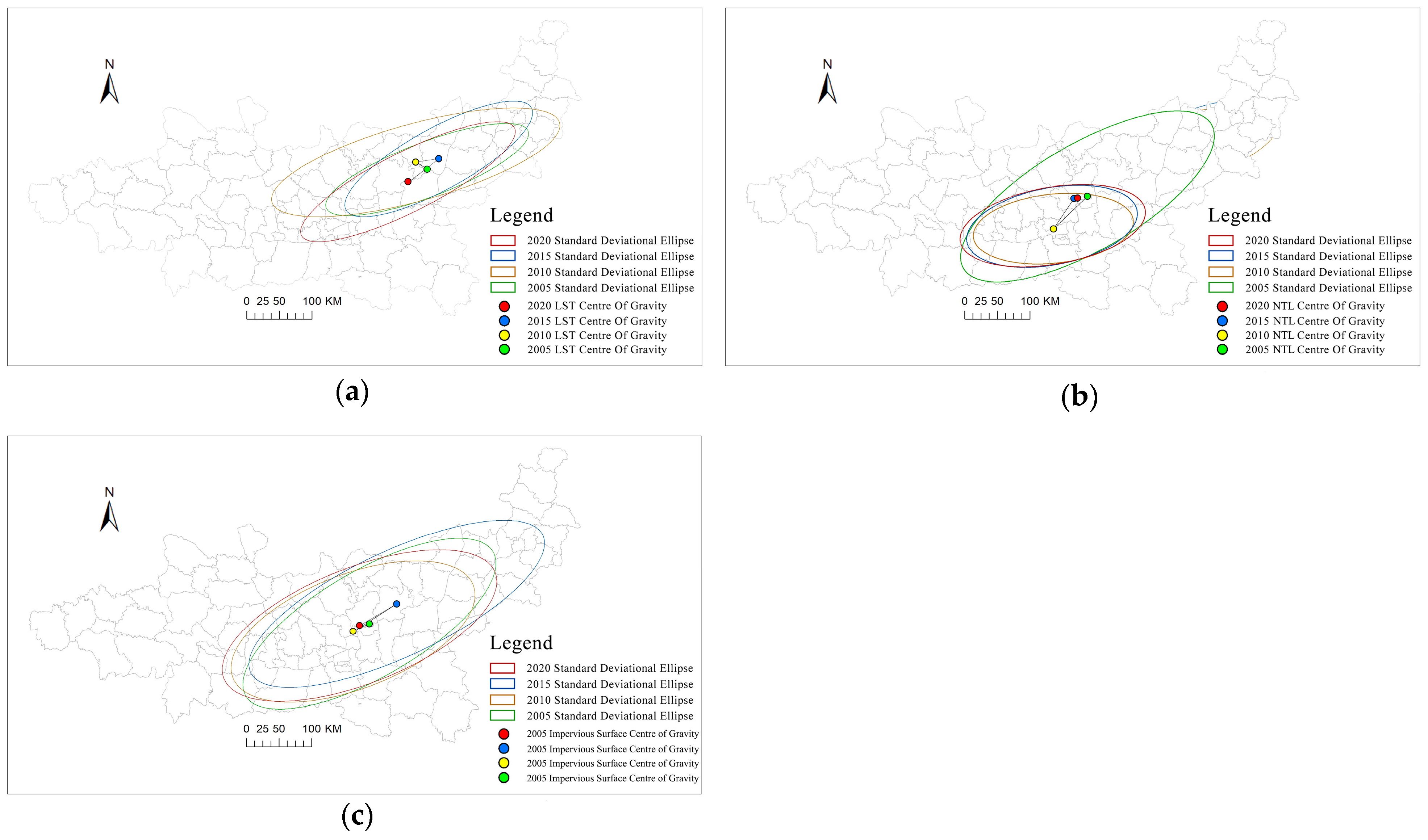 - During the research period, there was a noticeable increase in the correlation between NTL and LST in the built-up areas of different cities in the GZPUA. The spatial centers of gravity of LST, NTL, and built-up land produce highly overlapping trajectories toward the southwest, and urban development produces the same dynamic trend.
