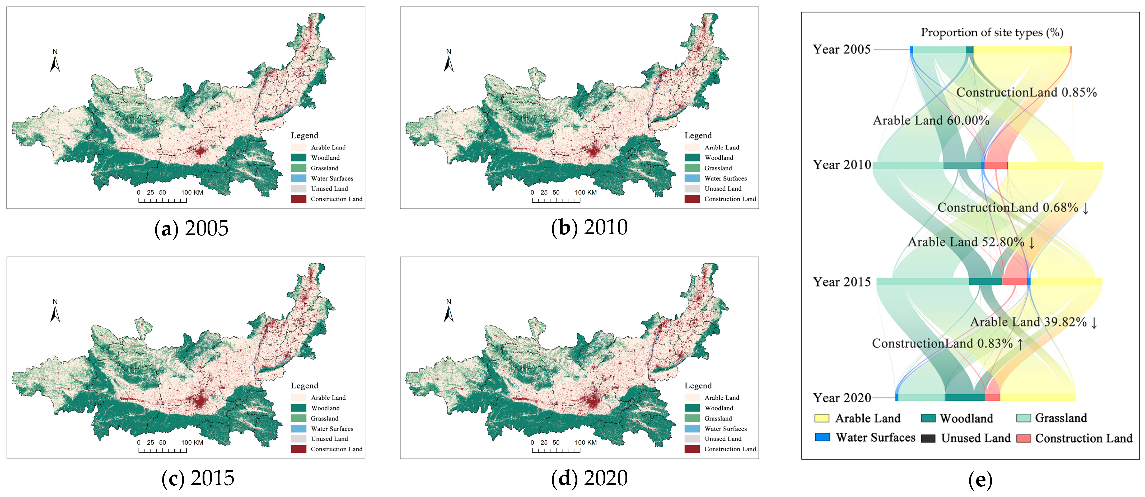 - Xu, H.; Li, C.; Wang, H.; Liu, M.; Hu, Y. Impact of land use change on the spatiotemporal evolution of the regional thermal environment in the Beijing-Tianjin-Hebei urban agglomeration. China Environ. Sci. 2023, 43, 1340–1348. [Google Scholar]