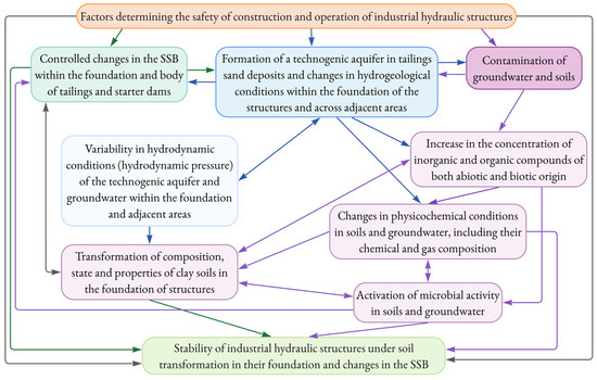 This article analyses the necessity of employing an interdisciplinary approach in the geotechnical practice of designing, constructing, and operating industrial hydraulic structures—tailings dams of processing plants. Tailings dam failures often lead to irreversible consequences for the ecological state of the environment. The interdisciplinary approach involves treating the foundation soils of structures and anthropogenic tailings deposits as a multicomponent system. In this system, soil acts as a medium hosting groundwater of varying compositions and contamination levels, containing biotic components and their metabolic products, including the gaseous phase. It has been demonstrated that the justified application of this approach increases the operational safety of existing structures and the long-term stability of starter and tailings dikes built on weak clay foundation soils. Particular emphasis is placed on the biotic component and the dual role of subsurface microorganisms. These bacteria negatively impact the strength and load-bearing capacity of water- and water–gas-saturated clay soils in the foundation of the structures under consideration. The diverse biocenosis in groundwater simultaneously facilitates self-purification from petroleum hydrocarbons to undetectable levels. This aspect holds fundamental importance, as groundwater discharges into river systems.