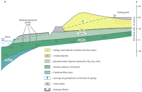 The glaciolacustrine deposits contain a relatively uniform aquifer, where sandy layers and lenses act as the water-bearing zones. As is known, the waterlogging of an area affects the chemical composition of groundwater as well as its physicochemical and biochemical parameters [19]. Prior to the operation of the tailings storage facilities, the chemical composition of the groundwater was characterised as sodium–calcium bicarbonate type, with total dissolved solids (TDS) of 0.3–0.6 g/dm3 (Table 1).