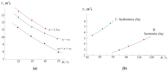 Changes in the spin-lattice relaxation time T1 of pore water depending on (a) the content of the clay fraction in the soil (Mc) and the moisture state of the soil (wL and wP are the moisture contents at the liquid limit and plastic limit, respectively) and (b) the mineral composition of clay soils [49].