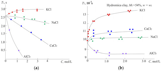 Changes in the spin-lattice relaxation time T1 of water protons (a) in solutions depending on their concentration C and (b) in pore solutions of clay soils depending on concentration C [49].
