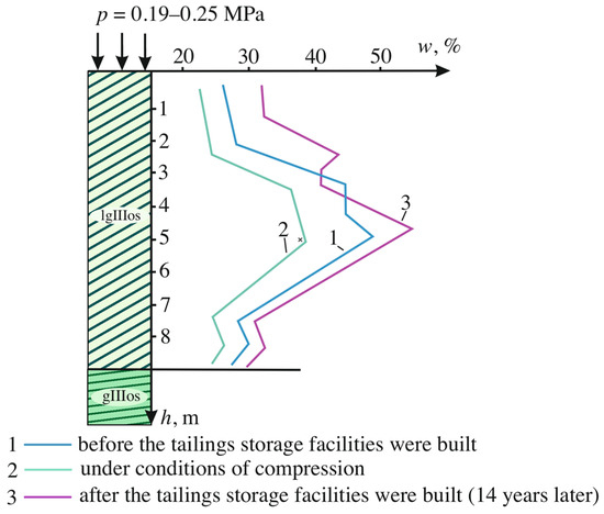These results reveal a consistent pattern in moisture content w variation with depth h, characterised by a central maximum due to the increased clay fraction content Mc in the soils. The analysis of Figure 6 indicates that there is no evidence of the filtration consolidation process. After 14 years of operation of industrial hydraulic structures, a slight increase in moisture content w is observed in the foundation soils due to the formation of anaerobic conditions, a reduction in iron compounds Fe3+, and a sharp decline in clay soil aggregation, which enhance hydrophilicity through dispersion. Accordingly, a slight increase in w is also expected in the absence of a filtration consolidation process.