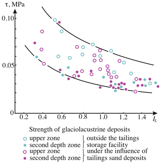 The dependence of the strength variation τ of glaciolacustrine clay deposits as the foundation soils of tailings storage facilities on their liquidity index IL [49].