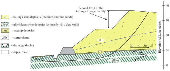 During the initial stage of tailings storage facility operation, as per design specifications, the need to ensure stability was justified on the basis of the principles of filtration consolidation. Stability analysis for starter and tailings dams was performed using shear strength parameters—the angle of internal friction (ϕ) and cohesion (c)—derived from consolidated drained (CD) tests, a method widely used in geotechnical engineering practices across many countries. The use of CD values for ϕ and c led to the development of landslide displacements, affecting both starter and tailings dams, accompanied by the extrusion of weak clay foundation soils and the formation of an extended ridge. The design was conducted without considering the weak layer, employing ϕ = 18°, c = 0.028 MPa for the upper zone of the engineering–geological cross-section and ϕ = 15°, c = 0.022 MPa for the second zone. The subsidence of the dam crest caused the failure of the tailings pond, resulting in an emergency discharge of contaminated water into the Baltic Sea river system. Following the accident, scientific and engineering investigations were initiated by the Department of Hydrogeology and Engineering Geology at Empress Catherine II Saint Petersburg Mining University under the supervision of Prof. R.E. Dashko.