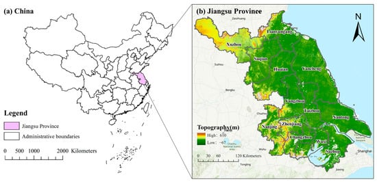 Jiangsu Province is located in the mid-latitude region of China’s eastern coastal area between 116°22′ E and 121°55′ E and 30°46′ N and 35°07′ N, the study area is shown in Figure 1. It is a typical East Asian monsoon climate zone, characterized by a mild and humid climate with distinct monsoon features [3]. The area regulates 13 prefecture-level cities, covering up to a range of approximately 107,200 square kilometers. The landscape is level and open, with a huge zone of waterways, giving a strong biological establishment and noteworthy potential for development and asset utilization [4]. As a vital portion of China’s coastal financial belt and the center component of the Yangtze Stream Delta urban agglomeration, Jiangsu Area incorporates a significant financial yield within the nation, with a high level of industrialization. Its mechanical structure is ruled by fabrication and other industries, with a solid reliance on fossil fuel power for vitality, resulting in high resource utilization and driving carbon emanations across the nation, in this way significantly contributing to carbon emissions [23]. Recently, driven by fast urbanization, the development of transportation infrastructure, and mechanical development, the land use design in Jiangsu Territory has experienced extreme changes, with a lessening in environmental emissions and challenges to the carbon sequestration capacity of the environment. Meanwhile, as one of the first pilot provinces for carbon peaking in China, Jiangsu has clearly put forward key tasks such as “strengthening dual control of energy, optimizing spatial layout, and improving ecological quality” during the 14th Five-Year Plan period, committing to achieving the carbon peaking goal before 2030. Therefore, under the national “dual carbon” strategy, conducting land use optimization research oriented towards enhancing carbon storage not only helps to strengthen the regional ecosystem’s carbon sequestration capacity but also provides spatial support and a scientific basis for achieving the carbon peaking path under high-quality development.